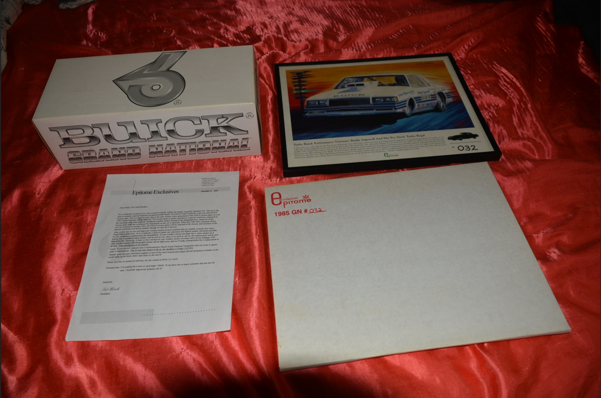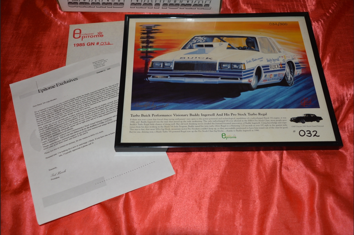 Made by GMP, 1985 Buick Grand National, a 1:18 scale diecast car (1 of 3100 made), part #8007, with the limited edition Buddy Indersoll signed Lithograph (only 1 of 300 created)!