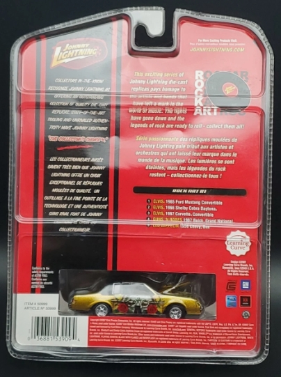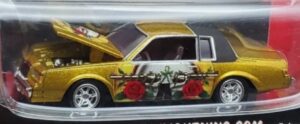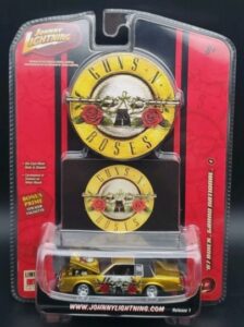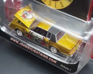 From the “Rock Art” release 1 set, (with 5 different cars in this series), this gold colored car with the Guns ‘N Roses theme spread across the sides & hood, has a black vinyl roof and 6-spoke chrome rims along with chrome bumpers.