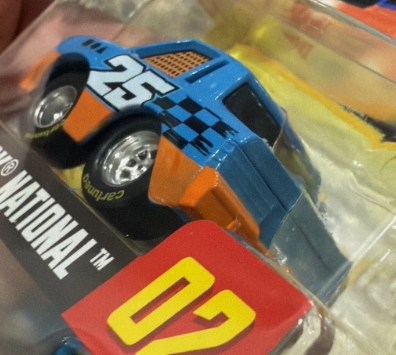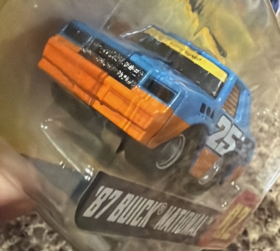 It is a two-tone colored car, blue on the top, orange on the bottom. It bears the number 25 on the sides, as well as the checkerboard flag. Chrome slotted wheels finish off this Buick.