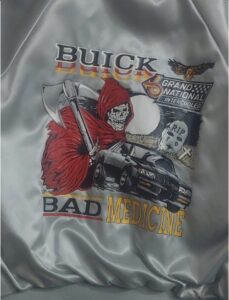Finally, a satin finish (typical styling from the 1980s!) Buick Grand National jacket, with the GN logo on the front left chest, and the way cool “Bad Medicine” image on the rear.